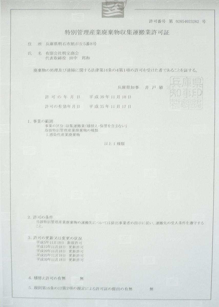 兵庫県特別管理産業廃棄物収集運搬業 第02854023282号